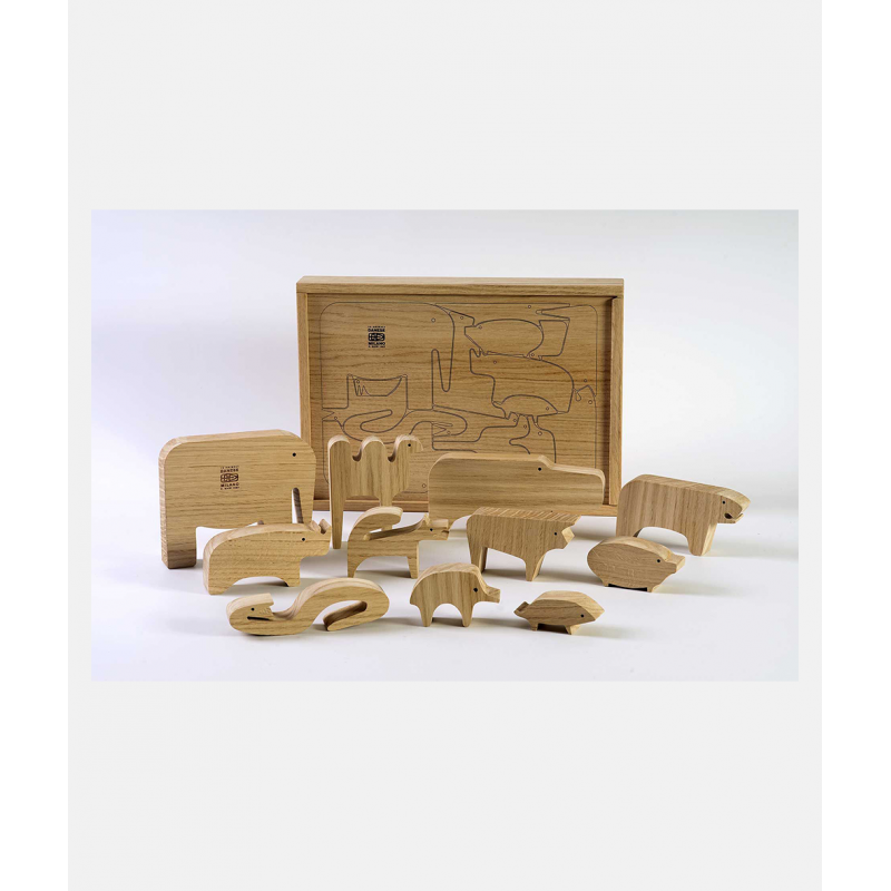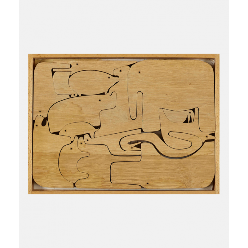 The 16 Animali Puzzle by Enzo Mari is an iconic modernist wooden puzzle, designed to produce 16 different animal shapes, made with just one continuous cut, from a single piece of wood. The modular puzzle became one of the most famous examples of educational design applied to the field of didactic objects. First produced for Danese Milano in 1957, the Animali puzzle marked the start of a long collaboration between Enzo Mari and Danese Milano. Since 2003, Danese have reissued a limited run of 200 puzzles each year.